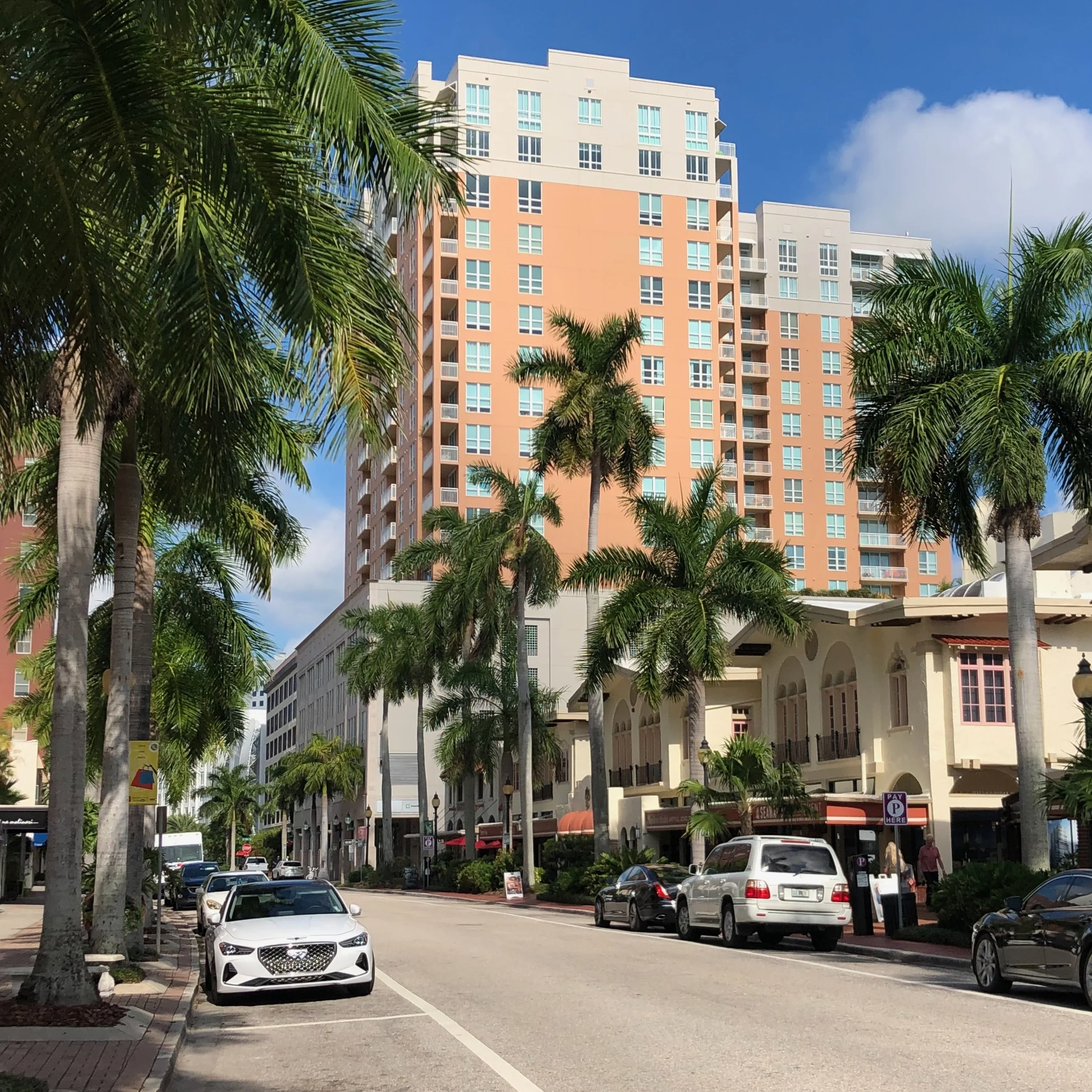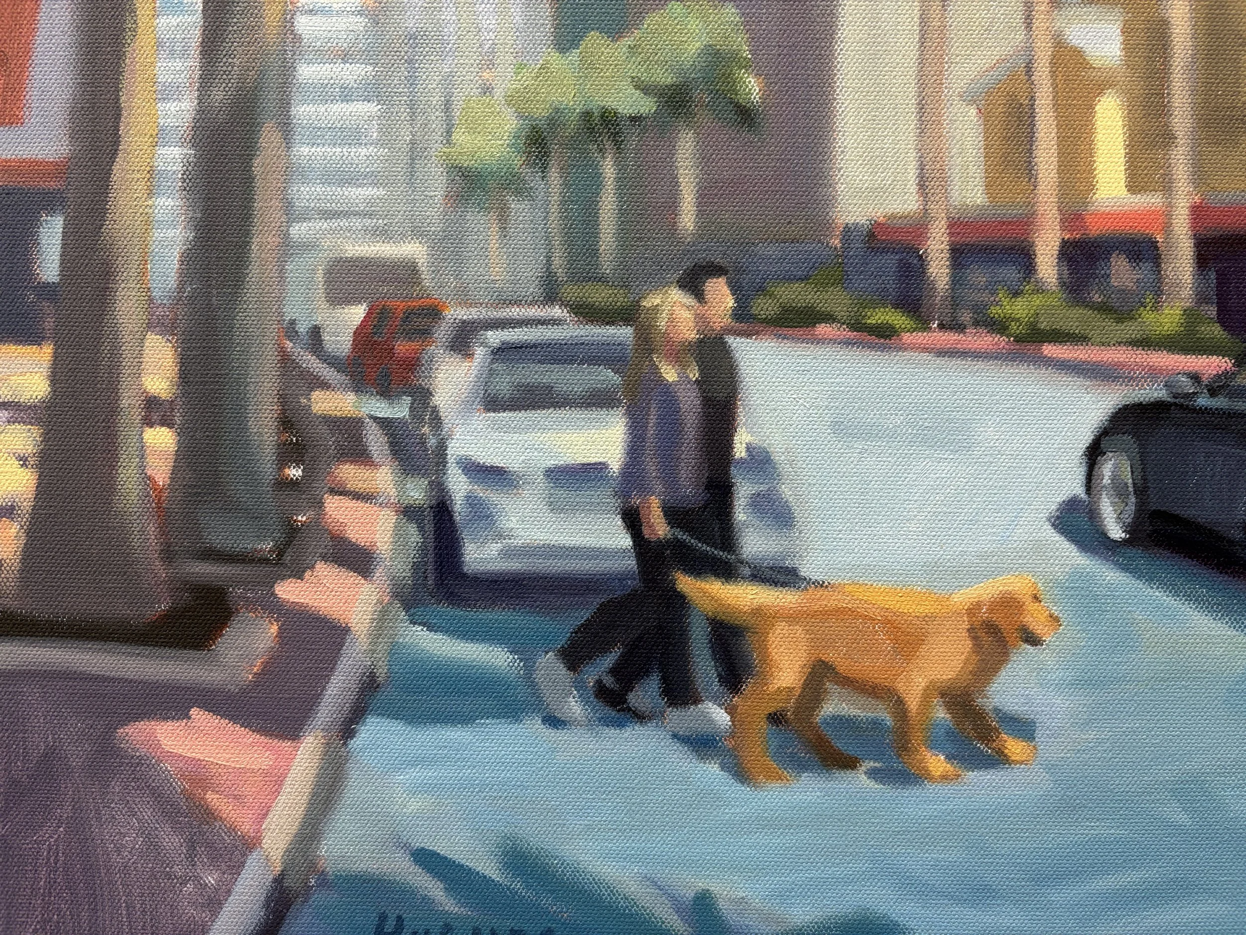 The bits of red accents in the awnings on the right add interest and the color is repeated in the red car on the left. The color of the red golden retriever echoes the salmon of the building.