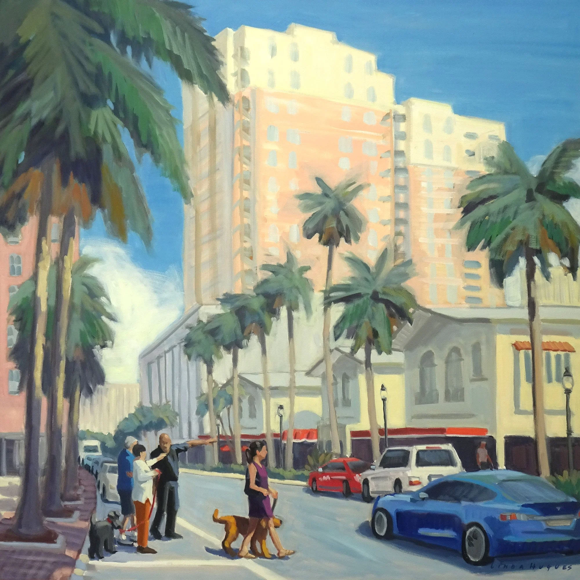 In this sketch the shape of the white/salmon building makes a strong statement against the sky. The line of the palms and buildings on the right bring you into the distance. I like the repeated shapes of the storefronts on the right and those spots of yellow in the sunlight.