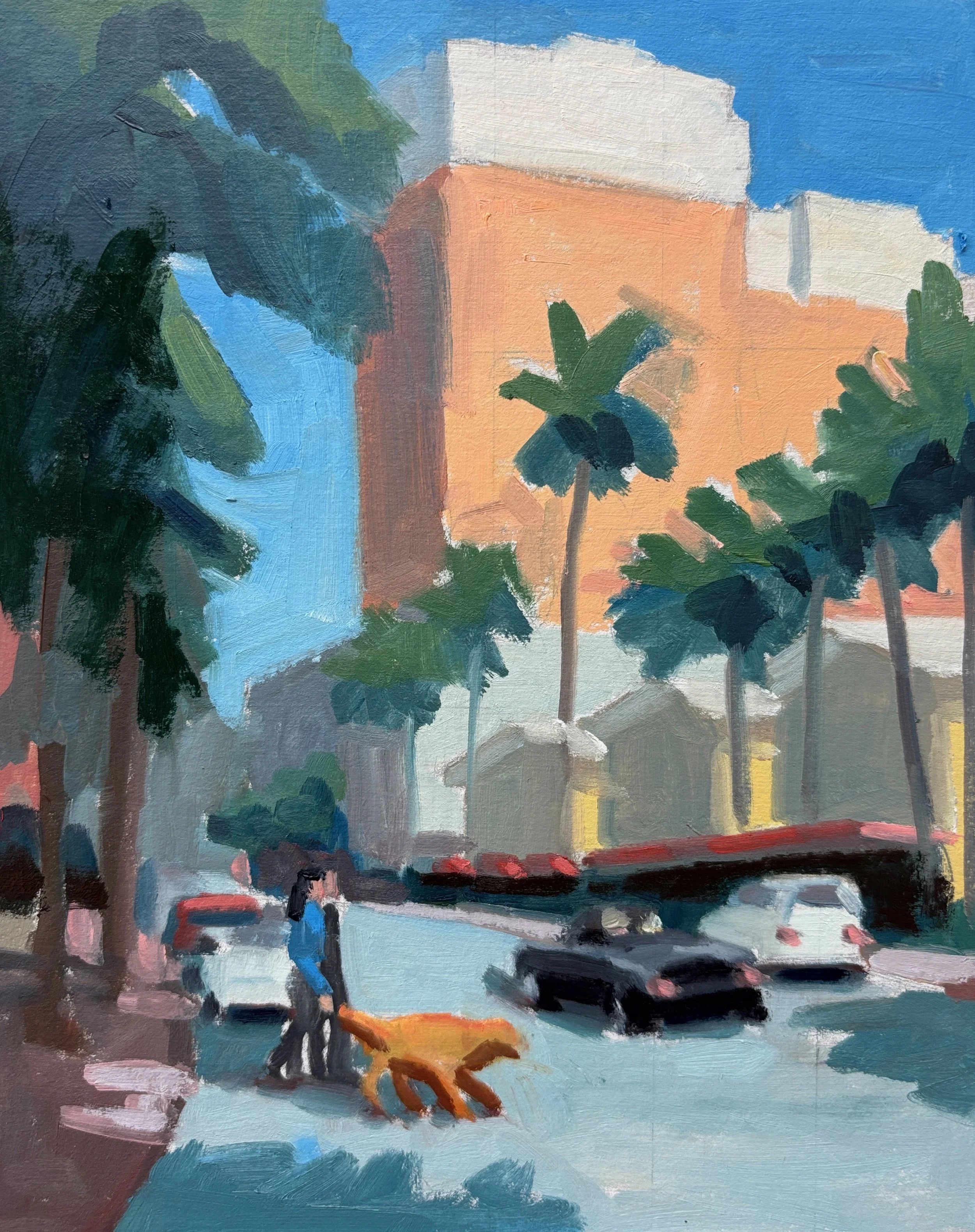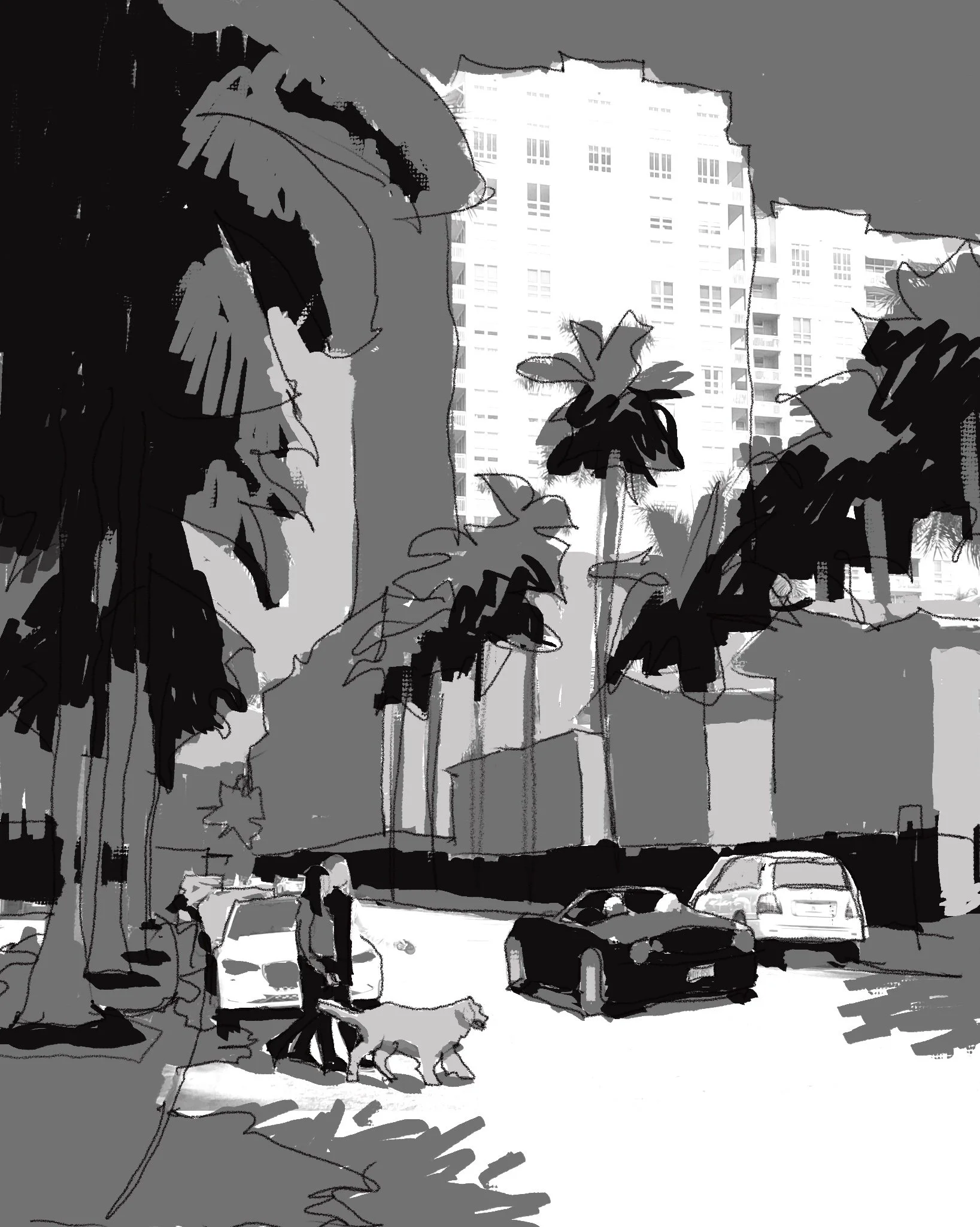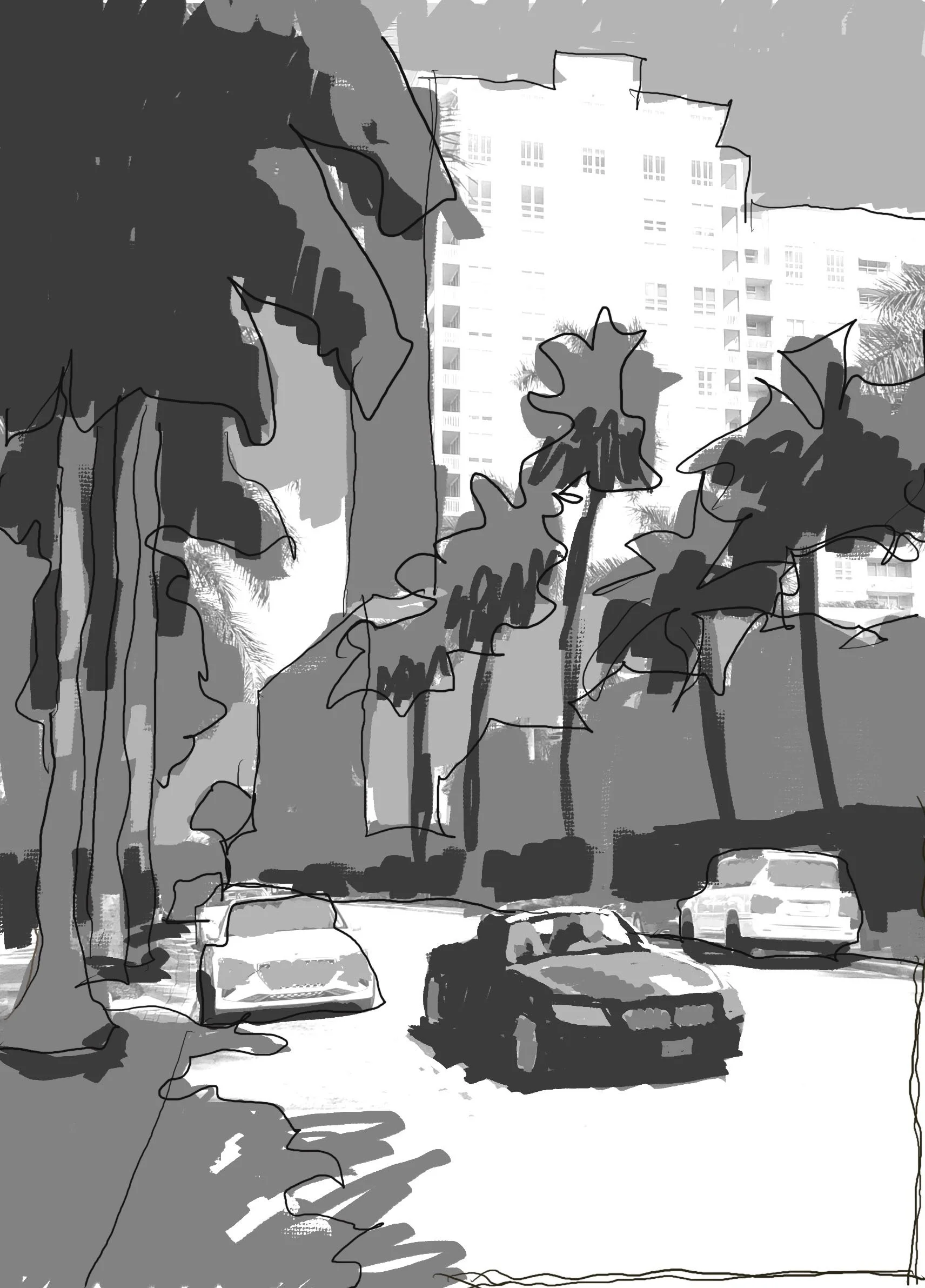 In this sketch I like the balance of the big dark shape of the palms on the left with the smaller dark of your car. I like the lines of the dark palms on the right that leads you into the painting. I’ve added a few tree shadows in the foreground for interest and to make the street a clearer diagonal line to the left.
